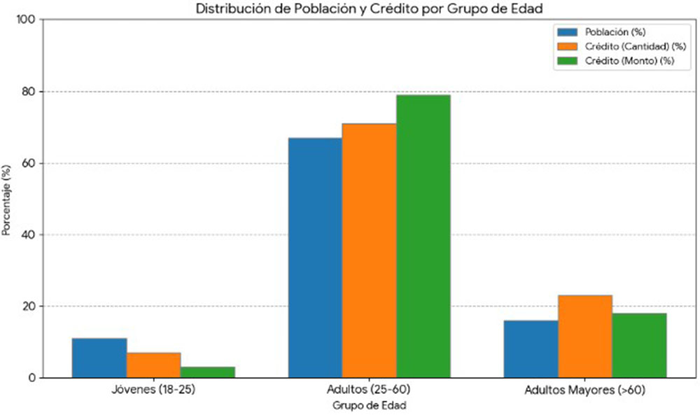 En el caso de los adultos mayores sólo reciben el 23 % de los créditos, con un 18 % de los montos, dados sus menores ingresos en relación a los del resto de la población.