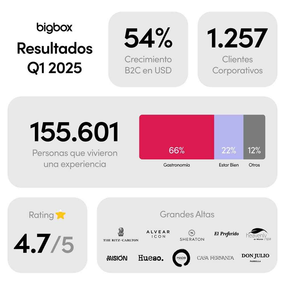 El ecosistema de experiencias también mostró una expansión significativa: más de 155.600 personas vivieron una experiencia Bigbox, destacándose las categorías gastronómicas y de bienestar como las más elegidas. La satisfacción del usuario continúa siendo una de las prioridades de la compañía, con una calificación promedio de 4.7 sobre 5 en su plataforma.
