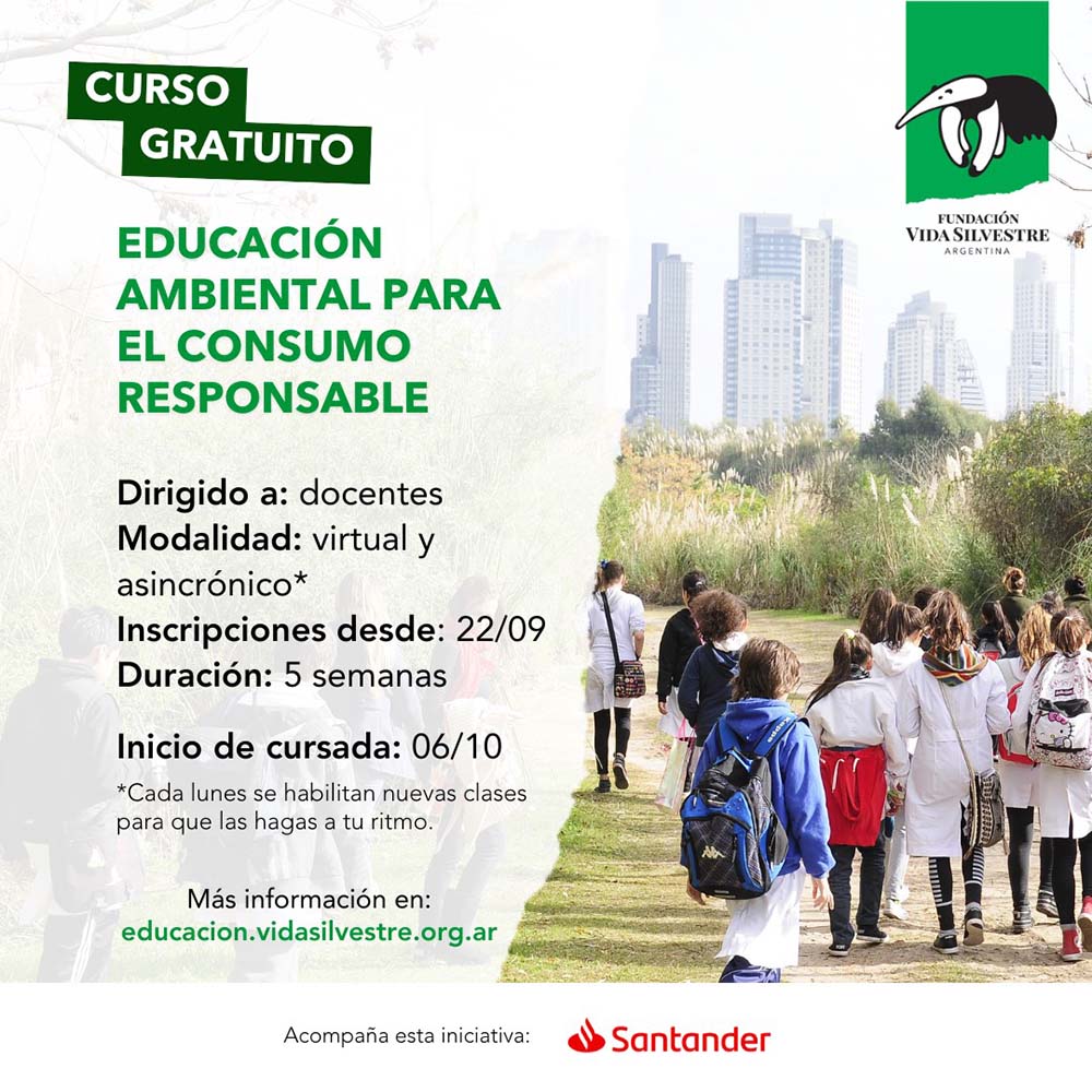FUNDACIÓN VIDA SILVESTRE ARGENTINA INVITA A PARTICIPAR DE UN NUEVO CURSO GRATUITO, VIRTUAL Y ASINCRÓNICO SOBRE CONSUMO RESPONSABLE Y EDUCACIÓN AMBIENTAL, PENSADO ESPECIALMENTE PARA DOCENTES Y MULTIPLICADORES/AS AMBIENTALES. LAS INSCRIPCIONES SE ABREN EL LUNES 22 DE SEPTIEMBRE A TRAVÉS DEL SITIO WWW.EDUCACION.VIDASILVESTRE.ORG.AR. EL CURSO CUENTA CON EL APOYO DE SANTANDER ARGENTINA Y BRINDA PUNTAJE DOCENTE EN CABA Y LA PROVINCIA DE CHUBUT.