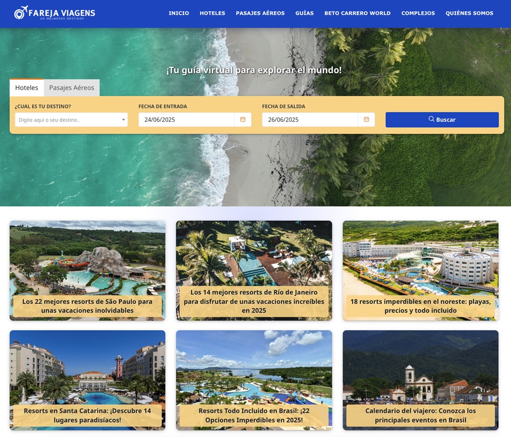 El sitio también cuenta con guías de viaje actualizadas, centradas en los mejores destinos de Brasil y de todo el mundo. Los nuevos artículos incluyen consejos prácticos, itinerarios personalizados y sugerencias para todo tipo de viajeros, desde mochileros hasta familias que buscan comodidad. Incluso hay una guía especial con los mejores resorts todo incluido en Brasil, ideal para quienes quieren relajarse sin preocupaciones.