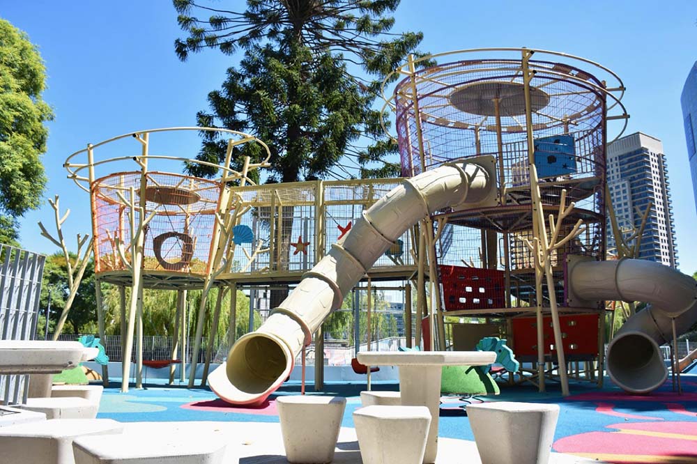 El parque suma además un nuevo patio de juegos inspirado en la obra “Las Nereidas” de la escultora Lola Mora. El espacio propone un recorrido temático con sectores sensoriales, áreas de calma y zonas de exploración activa, con juegos que invitan a trepar, deslizarse y explorar, instalados sobre un solado de caucho que mejora la seguridad de los chicos. En ese sector, además, se diseñó una protección especial para preservar una araucaria existente.