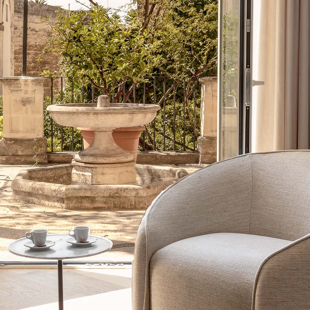 Ese legado atraviesa hoy el proyecto de Palazzo Bozzi Corso. La hospitalidad se concibe como una experiencia cultural, una forma de compartir una historia viva que continúa transformándose. El rooftop del palazzo ofrece una mirada elevada sobre Lecce, donde los techos de piedra y los campanarios componen un paisaje suspendido. La piscina refleja el cielo con una quietud contemplativa, invitando a una belleza que se interioriza y permanece.
