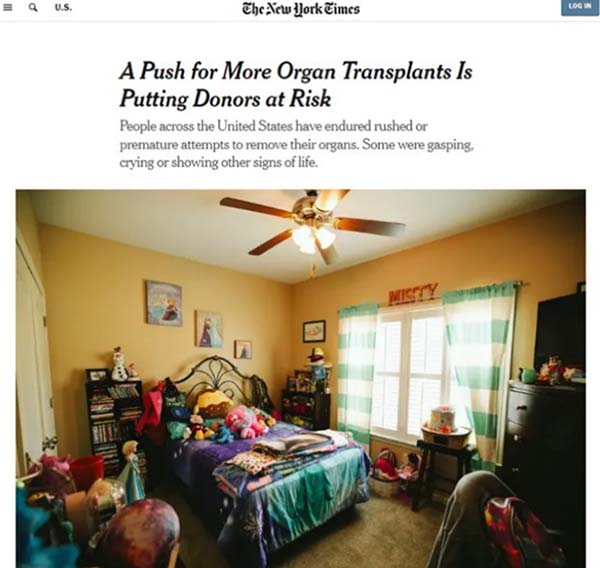 En julio de 2025, The New York Times publicó un reportaje de investigación sobre las prácticas de donación tras la muerte circulatoria (DCD) en Estados Unidos. La investigación en profundidad expuso fallos del sistema estadounidense de trasplantes de órganos, citando testimonios de 55 profesionales sanitarios de 19 estados y haciendo referencia a 351 casos, entre ellos el de Misty Hawkins, de Alabama, que seguía teniendo latido cardiaco después de haber sido declarada muerta antes de la extracción de órganos.