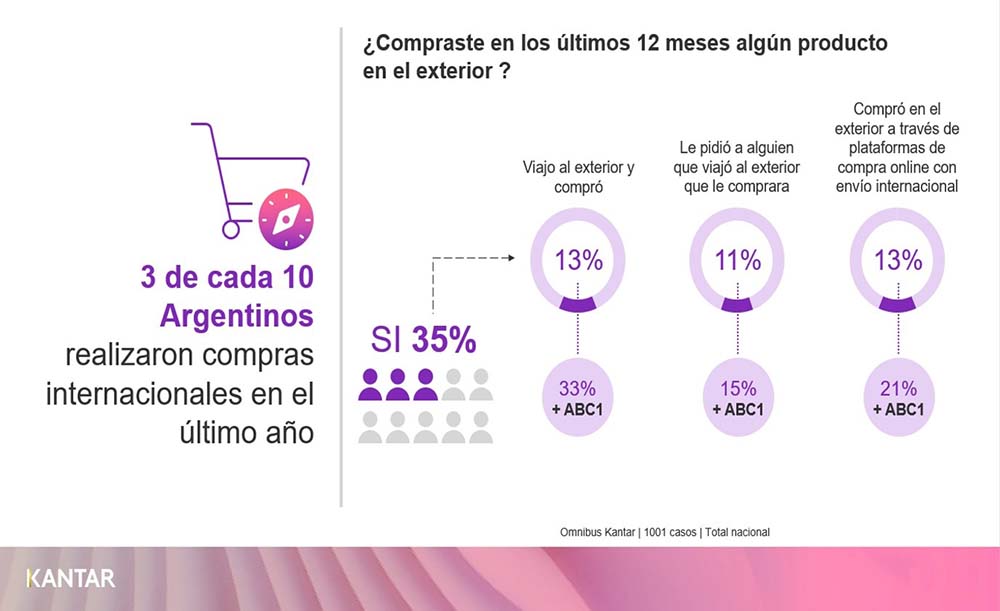 En el último año, 3 de cada 10 argentinos realizaron compras en el exterior (35%), ya sea porque viajaron (13%), las pidieron a alguien que viajaba (11%) o lo hicieron a través de plataformas de compra online con envío internacional (13%).