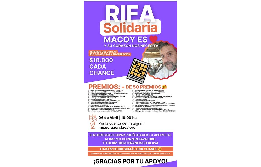 Lejos de quedarse de brazos cruzados, su círculo más cercano puso en marcha una red de apoyo que crece día a día. Bajo el lema “Mc Coy es ♥️ y su corazón nos necesita”, organizaron una gran rifa solidaria con el objetivo de reunir los fondos necesarios para que pueda operarse.