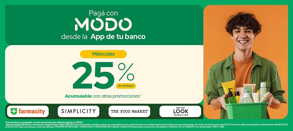 Como no podía ser de otra manera, juntos lanzan un beneficio imperdible, válido online y presencial: hasta el 30/04 inclusive, los usuarios podrán acceder todos los miércoles a un 25% de reintegro en las compras realizadas en Farmacity, Simplicity, Get The Look y The Food Market. La promoción cuenta con un tope de reintegro de $10.000 por usuario para compras mayores o iguales a $30.000 y es acumulable con otras promociones que apliquen pagando con MODO desde las apps bancarias y para entidades adheridas como Banco Nación, Macro, Supervielle, Credicoop, Ciudad, Santa Fe, Entre Ríos, Santa Cruz, Corrientes, San Juan, ¡y más!.