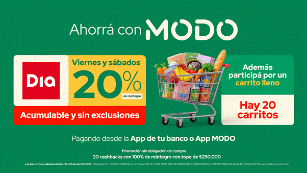- Dia – 20% de reintegro los viernes y sábados 24 y 25 de abril, en compras presenciales. Beneficio sin exclusiones. Con la compra realizada en esas fechas, los usuarios quedan automáticamente participando del sorteo de 20 carritos llenos con reintegro del 100% de la compra (tope de $250.000 por ganador).