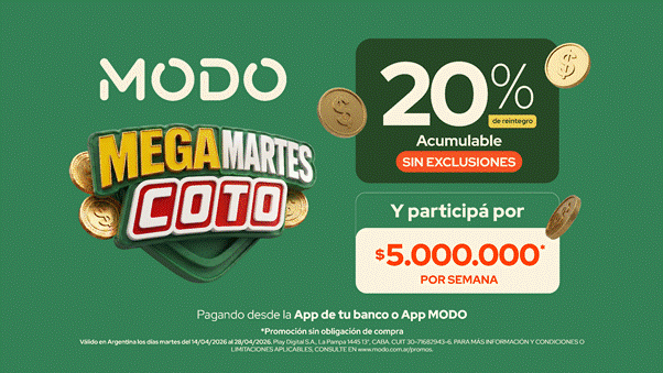 - Coto – 20% de reintegro los martes 21 y 28 de abril, en compras presenciales, en el marco de la propuesta “Mega Martes”. Beneficio acumulable. Con solo realizar compras en esas fechas, los usuarios participan automáticamente del sorteo de $5.000.000 por semana.