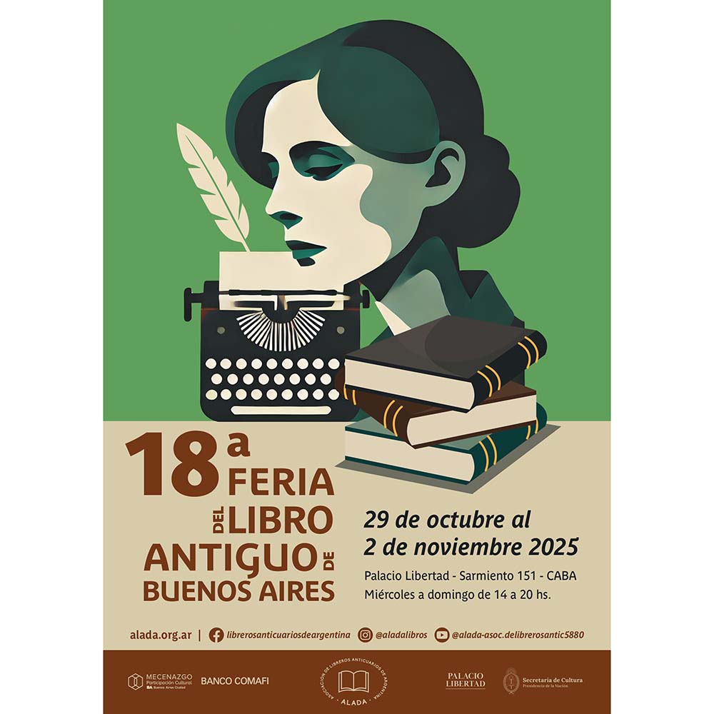 La 18ª Feria del Libro Antiguo de Buenos Aires se realizará del miércoles 29 de octubre al domingo 2 de noviembre, de 14 a 20 horas, en la Plaza Seca del Centro Cultural Palacio Libertad, Sarmiento 151, CABA. La Feria del libro Antiguo de Buenos Aires es organizada por la Asociación de Libreros Anticuarios de Argentina (ALADA), que celebra 25 años de su refundación.