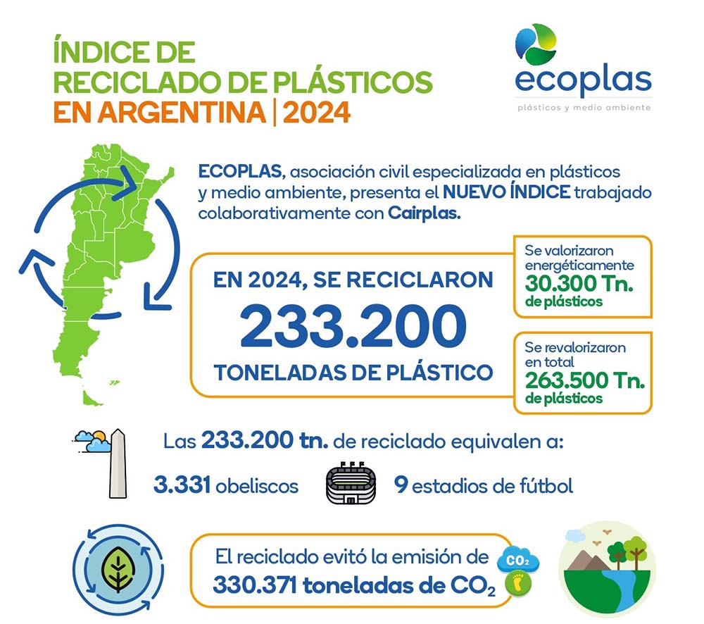 UN RELEVAMIENTO DE ECOPLAS INDICÓ QUE, EN ARGENTINA, EN 2024 SE REVALORIZARON 263.500 TONELADAS DE PLÁSTICOS. LA NECESIDAD DE POLÍTICAS PÚBLICAS PARA IMPULSAR SU CRECIMIENTO. Durante 2024, en Argentina se reciclaron mecánicamente 233.200 toneladas de plásticos y se valorizaron energéticamente otras 30.300 en hornos cementeros, según indica el último Índice Leer más