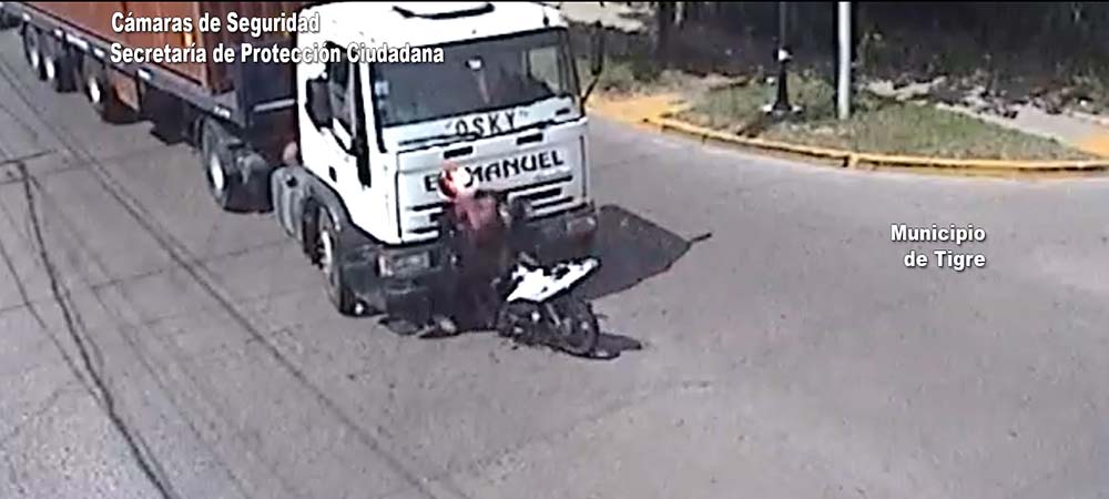 En Don Torcuato, las cámaras del Centro de Operaciones Tigre (COT) registraron un fuerte siniestro vial entre una moto y un camión: la motociclista fue trasladada al hospital de manera inmediata.
